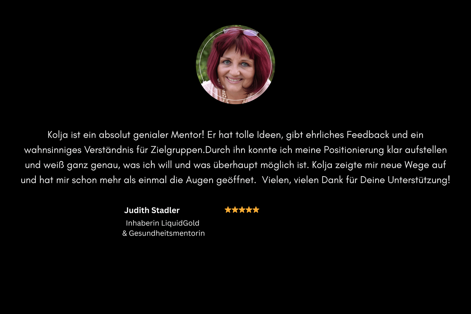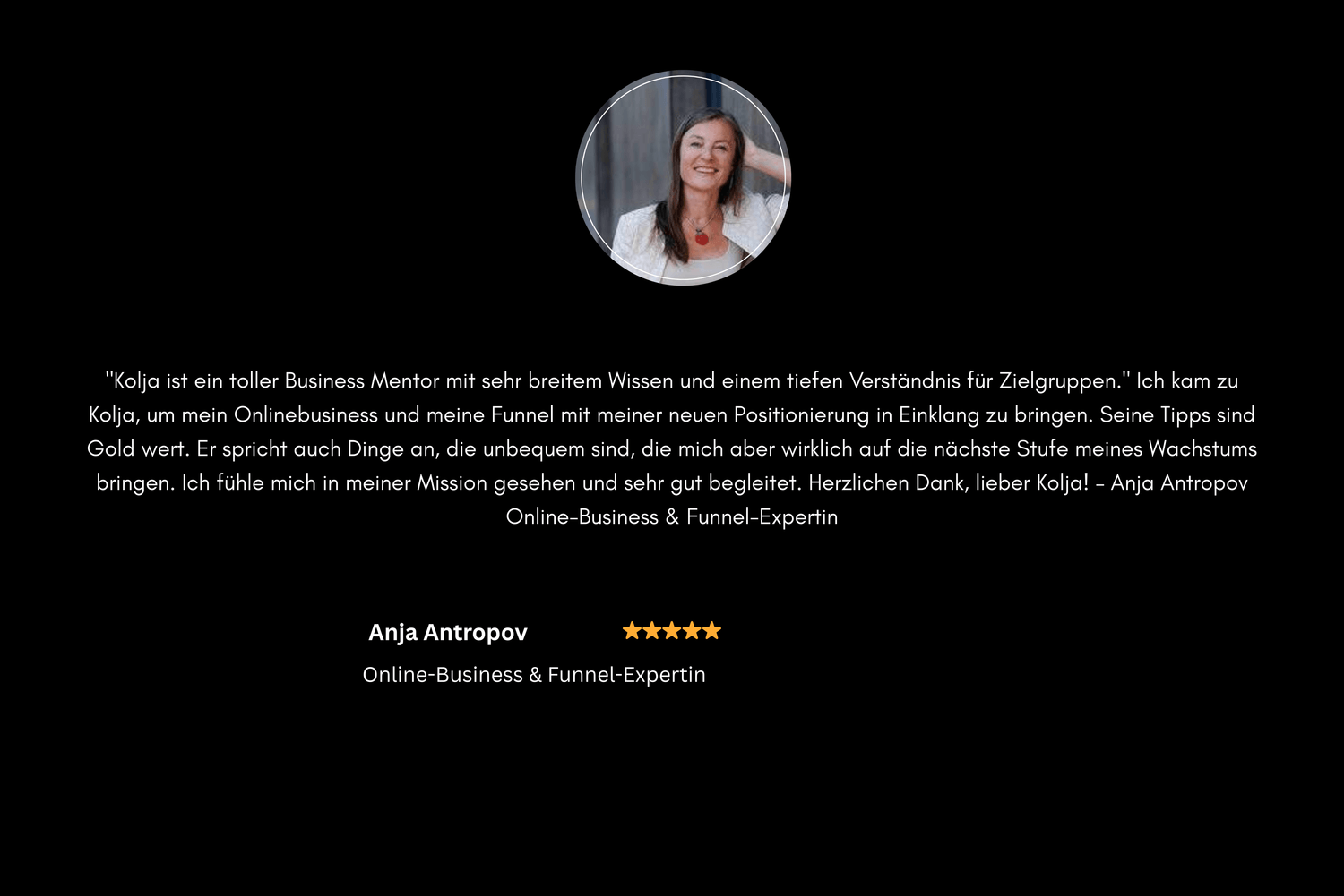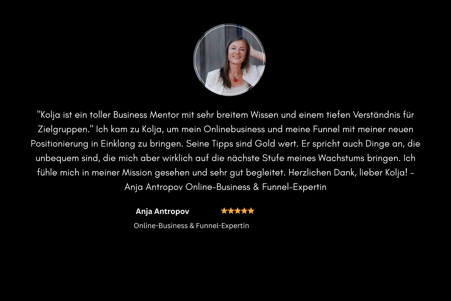 "Kolja ist ein toller Business Mentor mit sehr breitem Wissen und einem tiefen Verständnis für Zielgruppen." Ich kam zu Kolja, um mein Onlinebusiness und meine Funnel mit meiner neuen Positionierung in Einklang zu bringen. Seine Tipps sind Gold wert. Er spricht auch Dinge an, die unbequem sind, die mich aber wirklich auf die nächste Stufe meines Wachstums bringen. Ich fühle mich in meiner Mission gesehen und sehr gut begleitet. Herzlichen Dank, lieber Kolja! – Anja Antropov Online-Business & Funnel-Expertin