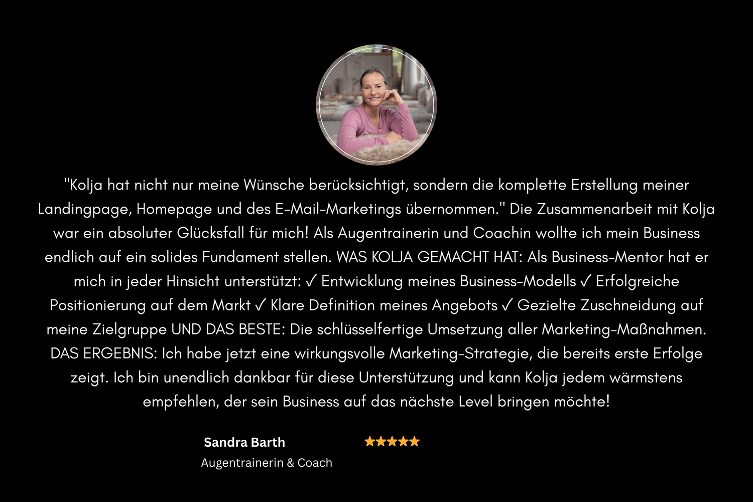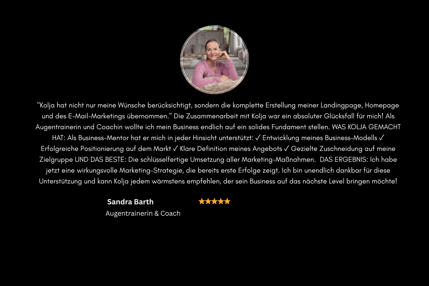 "Kolja hat nicht nur meine Wünsche berücksichtigt, sondern die komplette Erstellung meiner Landingpage, Homepage und des E-Mail-Marketings übernommen." Die Zusammenarbeit mit Kolja war ein absoluter Glücksfall für mich! MEINE AUSGANGSSITUATION: Als Augentrainerin und Coachin wollte ich mein Business endlich auf ein solides Fundament stellen. WAS KOLJA GEMACHT HAT: Als Business-Mentor hat er mich in jeder Hinsicht unterstützt: ✓ Entwicklung meines Business-Modells ✓ Erfolgreiche Positionierung auf dem Markt ✓ Klare Definition meines Angebots ✓ Gezielte Zuschneidung auf meine Zielgruppe UND DAS BESTE: Die schlüsselfertige Umsetzung aller Marketing-Maßnahmen. Kolja hat nicht nur meine Wünsche berücksichtigt, sondern auch die komplette Erstellung meiner Landingpage, Homepage und des E-Mail-Marketings übernommen. DAS ERGEBNIS: Ich habe jetzt eine wirkungsvolle Marketing-Strategie, die bereits erste Erfolge zeigt. Ich bin unendlich dankbar für diese Unterstützung und kann Kolja jedem wärmstens empfehlen, der sein Business auf das nächste Level bringen möchte!