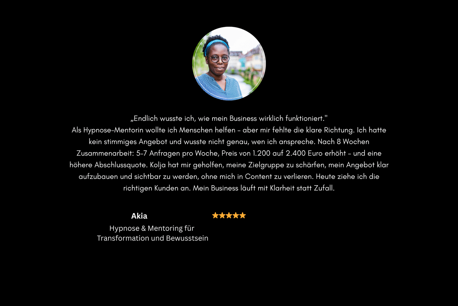 Als Hypnose-Mentorin wollte ich Menschen helfen – aber mir fehlte die klare Richtung. Ich hatte kein stimmiges Angebot und wusste nicht genau, wen ich anspreche. Nach 8 Wochen Zusammenarbeit: 5–7 Anfragen pro Woche, Preis von 1.200 auf 2.400 Euro erhöht – und eine höhere Abschlussquote.