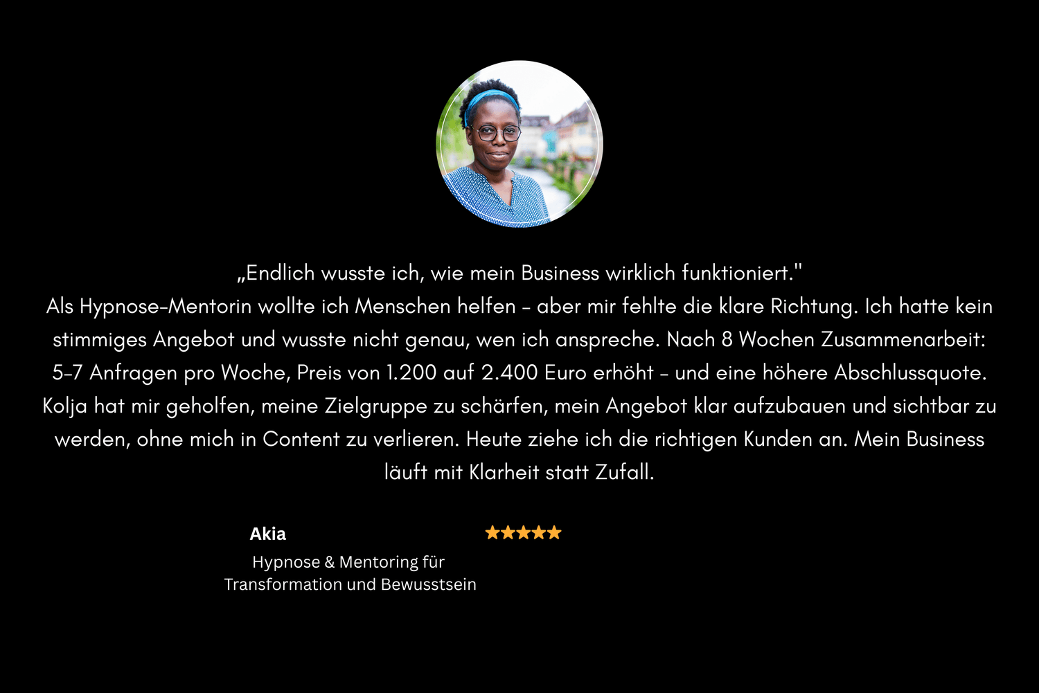 Kolja hat mir geholfen, meine Zielgruppe zu schärfen, mein Angebot klar aufzubauen und sichtbar zu werden, ohne mich in Content zu verlieren. Heute ziehe ich die richtigen Kunden an. Mein Business läuft mit Klarheit statt Zufall.