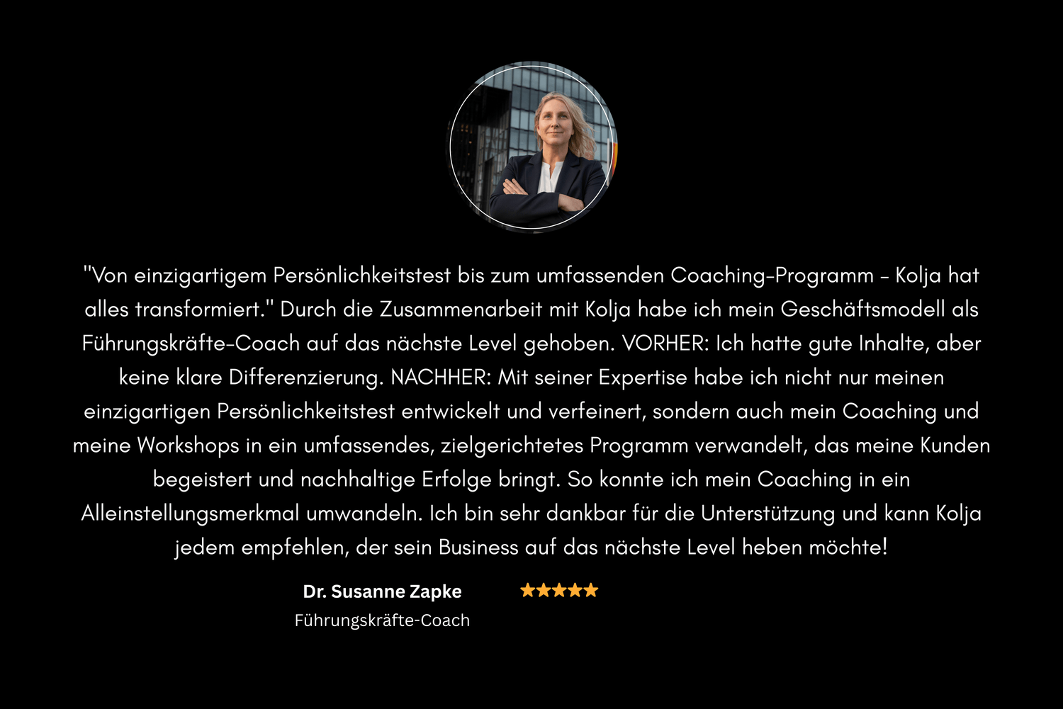 "Von einzigartigem Persönlichkeitstest bis zum umfassenden Coaching-Programm – Kolja hat alles transformiert." Durch die Zusammenarbeit mit Kolja habe ich mein Geschäftsmodell als Führungskräfte-Coach auf das nächste Level gehoben. VORHER: Ich hatte gute Inhalte, aber keine klare Differenzierung. NACHHER: Mit seiner Expertise habe ich nicht nur meinen einzigartigen Persönlichkeitstest entwickelt und verfeinert, sondern auch mein Coaching und meine Workshops in ein umfassendes, zielgerichtetes Programm verwandelt, das meine Kunden begeistert und nachhaltige Erfolge bringt. So konnte ich mein Coaching in ein Alleinstellungsmerkmal umwandeln. Ich bin sehr dankbar für die Unterstützung und kann Kolja jedem empfehlen, der sein Business auf das nächste Level heben möchte!